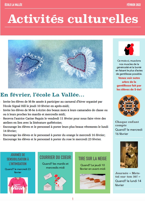 Accueillant des élèves de la maternelle à la 8ème, l’école La Vallée s’engage à développer l’identité culturelle des élèves ainsi qu’à promouvoir le développement d’une communauté francophone. Pour y arriver, elle offre une éducation publique francophone d’excellence qui favorise la maîtrise de la langue française, tout en offrant aux jeunes la possibilité de maîtriser une deuxième langue; la langue anglaise.