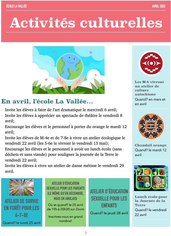 Accueillant des élèves de la maternelle à la 8ème, l’école La Vallée s’engage à développer l’identité culturelle des élèves ainsi qu’à promouvoir le développement d’une communauté francophone. Pour y arriver, elle offre une éducation publique francophone d’excellence qui favorise la maîtrise de la langue française, tout en offrant aux jeunes la possibilité de maîtriser une deuxième langue; la langue anglaise.